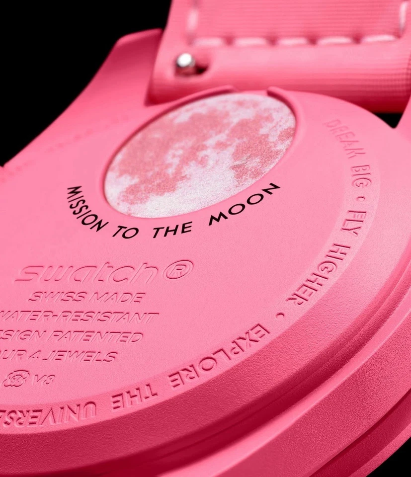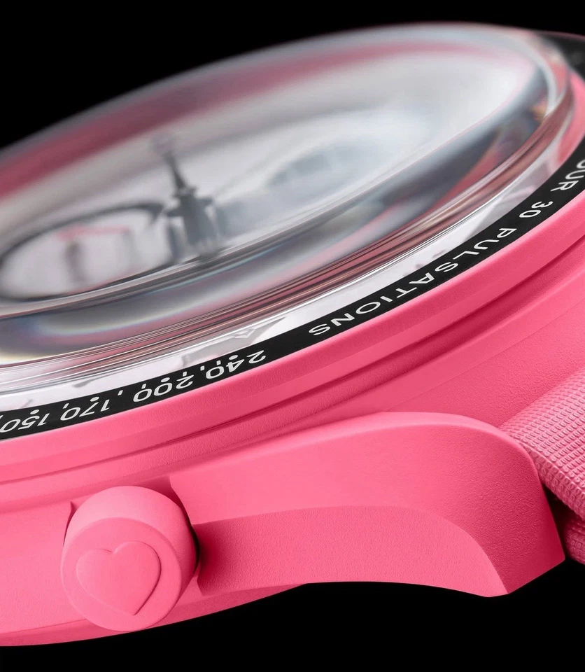 La Swatch x Omega MoonSwatch Mission to Moonphase Pink è l’ultima evoluzione dell’iconica collaborazione tra Swatch e Omega, una reinterpretazione giocosa e innovativa del leggendario Speedmaster Moonwatch, arricchita da un tocco inedito: la funzione Moonphase.