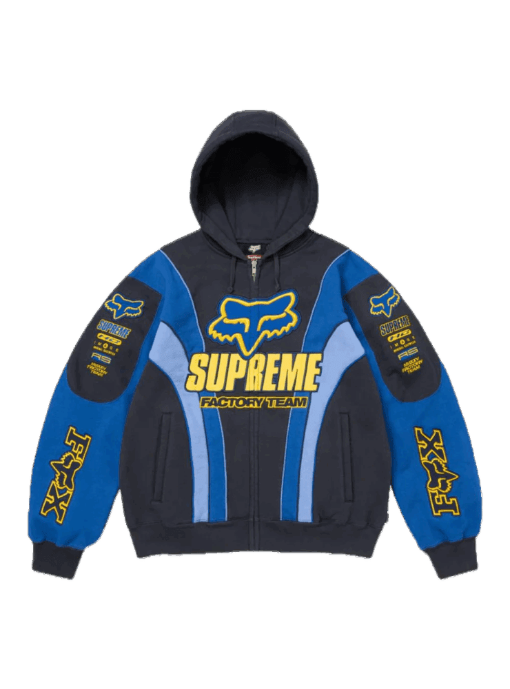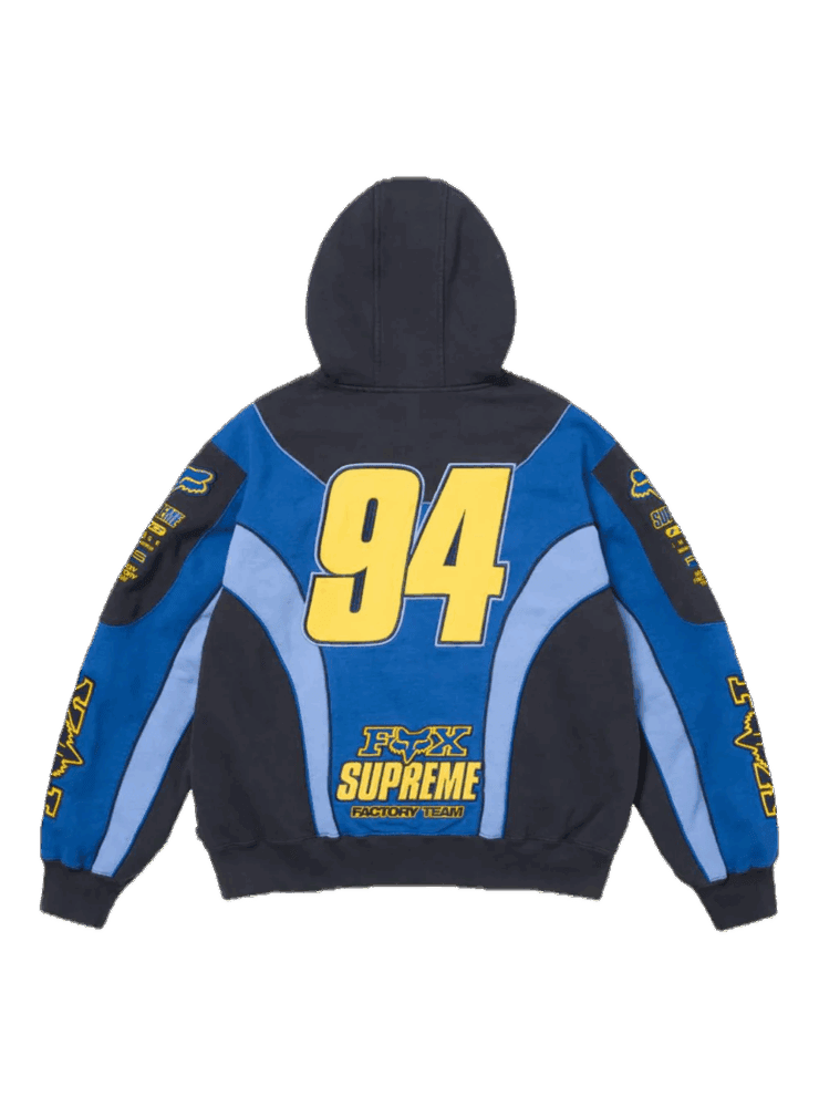 Sul petto campeggia l’iconico Fox Head logo ricamato o stampato in contrasto (bianco o nero), mentre le maniche possono includere grafiche racing o dettagli tipografici che richiamano l’heritage del brand. Il cappuccio è regolabile con cordino, la zip frontale è rinforzata e le tasche a sacco laterali completano il look con funzionalità.