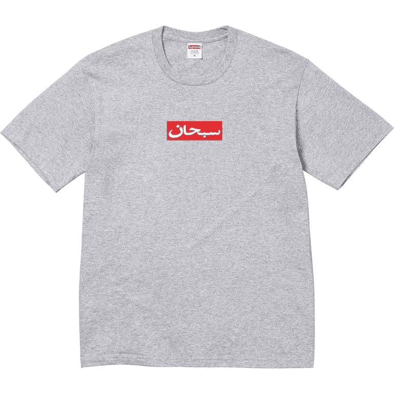 Realizzata in cotone 100% premium, con vestibilità regular fit, la t-shirt presenta una base Heather Grey pulita e versatile, perfetta per valorizzare il contrasto del logo. Al centro del petto spicca l’inconfondibile Box Logo Supreme in rosso, ma con la scritta resa in caratteri arabi bianchi, mantenendo intatta l’estetica minimal ma con un forte impatto culturale e visivo.