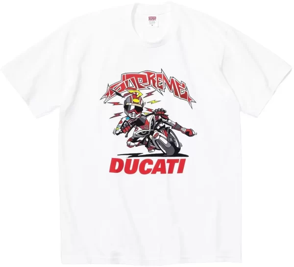 Sul petto o sul retro spicca una grafica co-branded Supreme x Ducati, che richiama l’estetica delle moto da competizione: loghi bold, lettering tecnici, dettagli motorsport e possibili richiami ai team racing ufficiali. Il risultato è una t-shirt che trasmette immediatamente velocità, adrenalina e attitudine.