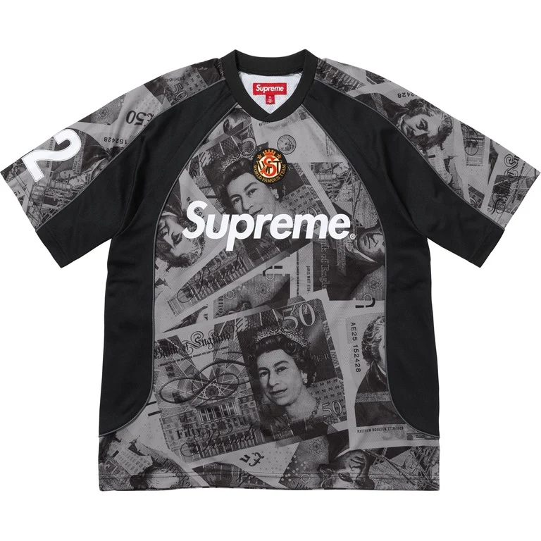 Sul petto spicca la scritta “POUNDS” in grande formato, ispirata ai font sportivi anni ’90, stampata o applicata in bianco netto per un contrasto forte e immediato. Il design può essere completato da numerazione oversize sul retro, logo Supreme integrato nel crest in stile club e dettagli piping sulle spalle per un tocco autenticamente calcistico.