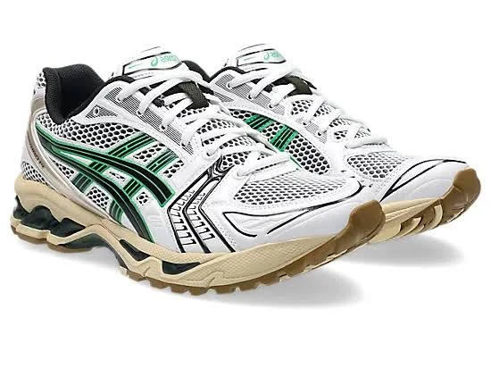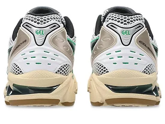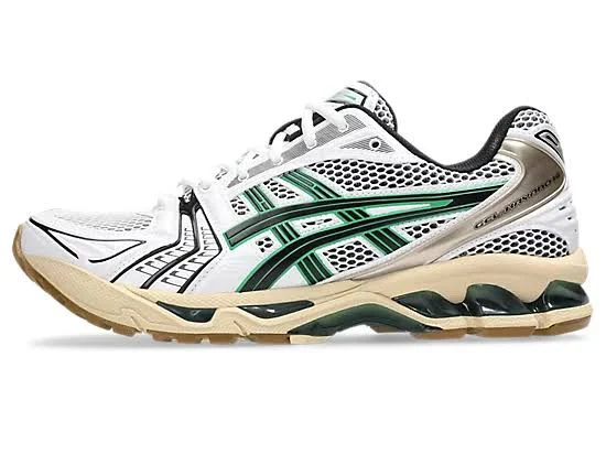 La tomaia è costruita con una combinazione di mesh tecnico traspirante e overlay sintetici stratificati, fedeli al design originale della Kayano 14. La base White dona luminosità e pulizia alla sneaker, mentre gli inserti Hinoki Beige aggiungono calore e profondità con una tonalità neutra e sofisticata. I dettagli metallici e riflettenti completano il design con un tocco autenticamente Y2K, esaltando la struttura tecnica della silhouette.