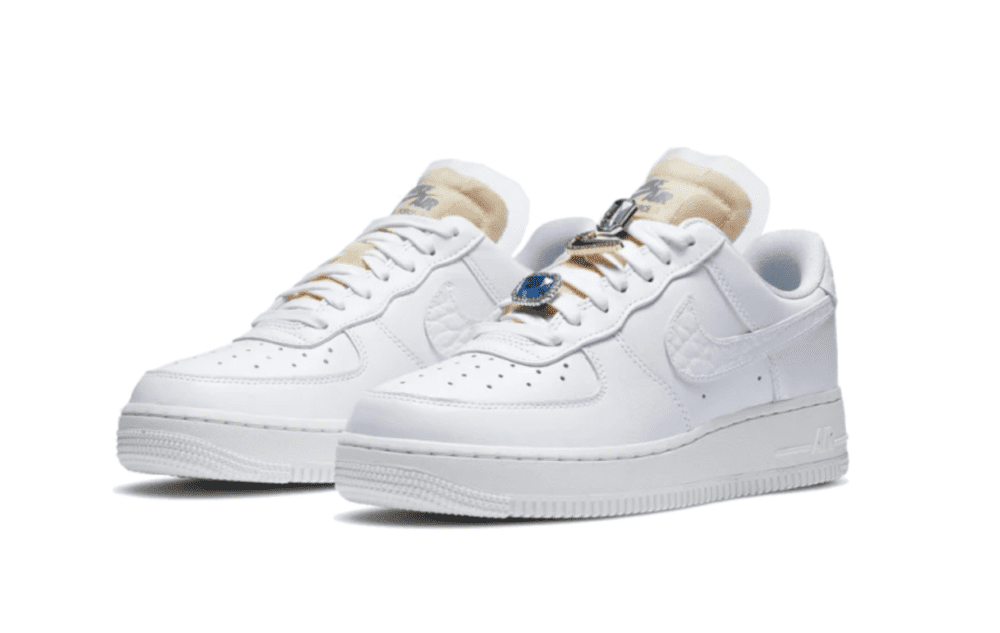 La tomaia è realizzata in pelle premium bianca, morbida al tatto e resistente, con una finitura pulita ed essenziale che mette in risalto i dettagli metallici. Il punto forte di questa edizione è l’accessorio gioiello “bling” applicato ai lacci, una decorazione lucente in metallo che conferisce un tocco glamour al design senza comprometterne la versatilità. Lo Swoosh laterale tono su tono, la linguetta in tessuto satinato e i dettagli in oro o argento (a seconda della release) completano l’estetica con un equilibrio perfetto tra lusso e semplicità.