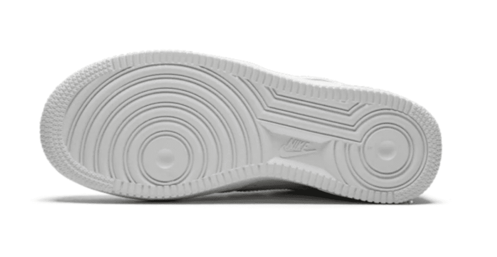 L’intersuola mantiene la classica costruzione delle AF1 con unità Air-Sole incapsulata, offrendo ammortizzazione e comfort durante tutta la giornata. La suola in gomma, bianca come la tomaia, conserva il battistrada circolare originale per garantire trazione e resistenza.