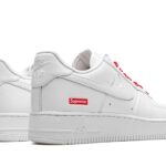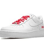 La tomaia è realizzata in pelle premium bianca, pulita e strutturata, fedele al design originale dell’Air Force 1 del 1982. Il vero protagonista è il Box Logo rosso Supreme applicato sul tallone laterale, piccolo ma immediatamente riconoscibile, che dona alla sneaker un’identità forte senza stravolgerne l’essenza. I lacci presentano la scritta “Supreme”, ulteriore dettaglio che rafforza il carattere della collaborazione.