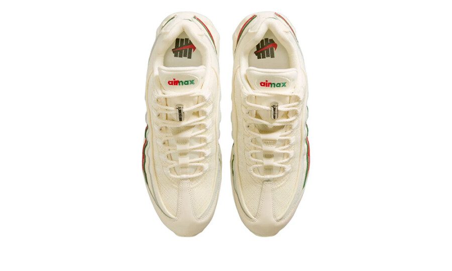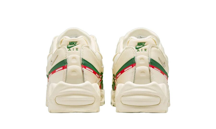 La tomaia presenta una combinazione di mesh traspirante, suede e pelle liscia, lavorata in tonalità sail, off-white e crema, che si fondono armoniosamente per esaltare le iconiche linee ondulate delle Air Max 95. Il branding Undefeated, ripetuto lungo le bande laterali in una finitura leggermente lucida, aggiunge un tocco distintivo senza interrompere l’equilibrio cromatico della scarpa.