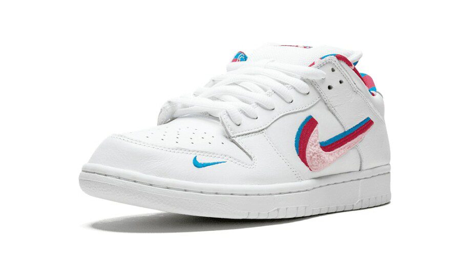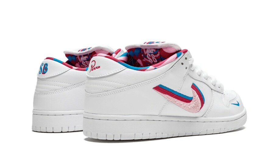 La tomaia combina pelle premium bianca con pannelli rivestiti dai caratteristici pattern multicolor firmati Parra, creando un look energico e fortemente distintivo. Lo Swoosh in pelle mantiene equilibrio visivo all’interno del design, mentre i dettagli ricamati e le finiture curate valorizzano la qualità della collaborazione. Il contrasto tra la base pulita e le grafiche astratte dona alla sneaker un’identità unica nel panorama Nike SB.