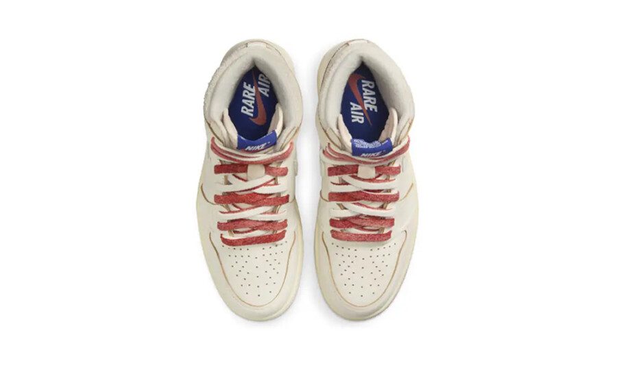 La tomaia è realizzata in pelle premium color Sail, una tonalità avorio che dona un aspetto pulito e raffinato alla scarpa. I dettagli in Cinnabar, un rosso bruciato acceso ma elegante, spiccano sugli Swoosh laterali, sulla suola e sul branding, creando un contrasto d’impatto. La particolarità di questa versione è la scritta “Rare Air” ricamata in sostituzione del tradizionale logo Wings, un dettaglio che richiama i prototipi originali delle Jordan 1, mai rilasciati al grande pubblico negli anni ’80.