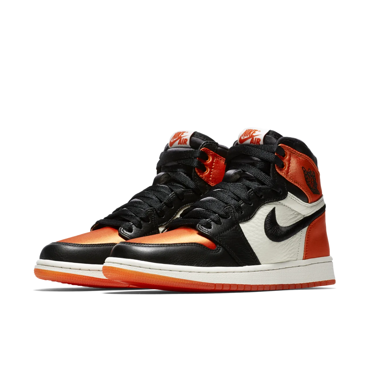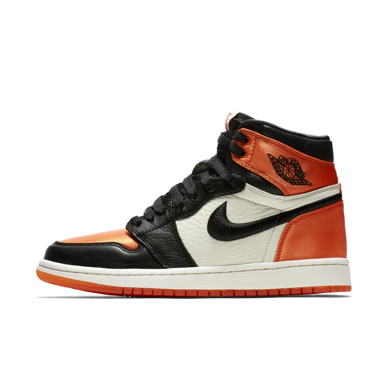 La tomaia è realizzata in satin arancione e nero, combinata con dettagli in pelle premium e l’inconfondibile Swoosh nero. L’effetto satinato dona alla sneaker un aspetto elegante e sofisticato, mentre la colorazione arancione, nero e bianco richiama il leggendario momento in cui Michael Jordan infranse il tabellone durante una partita in Italia nel 1985. La suola in gomma con tecnologia Air-Sole assicura comfort e ammortizzazione per un utilizzo quotidiano.