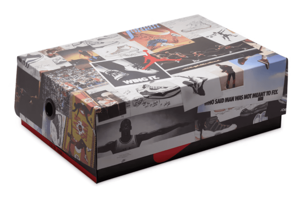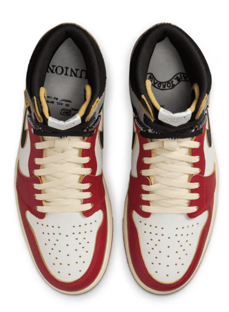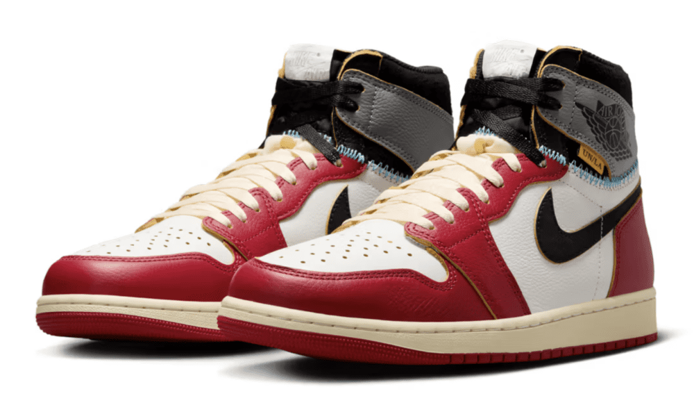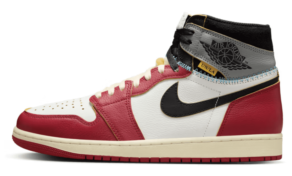 La tomaia è realizzata in pelle premium con un mix di tonalità classiche: la parte anteriore richiama la colorazione Chicago, con l’inconfondibile combinazione di bianco e rosso, mentre la parte posteriore prende ispirazione dalla Shadow, con toni di grigio e nero che donano un look sofisticato e versatile. Le cuciture a vista gialle, dettaglio distintivo della collaborazione Union LA, enfatizzano l’effetto “assemblato a mano”, richiamando l’idea di una sneaker ricostruita da frammenti di modelli storici. Il logo Wings vintage e l’etichetta in stile ingiallito sulla linguetta completano il design, donando un fascino retrò senza tempo.