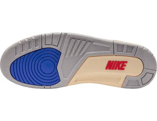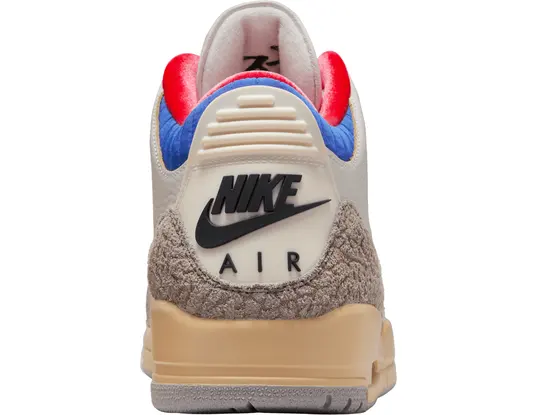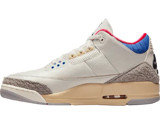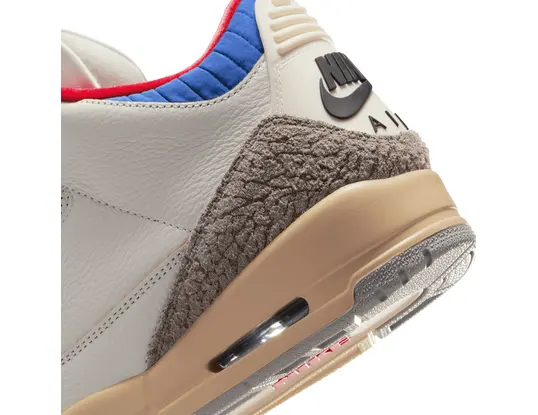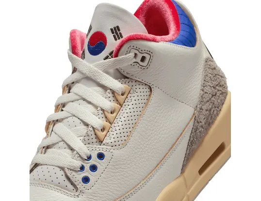 La tomaia è realizzata in pelle premium bianca, con finiture in elephant print grigio chiaro su punta e tallone, in omaggio all’estetica originale delle Jordan 3. La vera novità si trova nei dettagli: accenti in blu navy e rosso vivo — i colori della bandiera coreana — sono presenti sugli occhielli, sulla fodera interna e sulle cuciture, creando un contrasto deciso e armonico. Sul tallone spicca il doppio branding: Nike Air a sinistra, e la scritta “서울” (Seoul) a destra, simbolo del legame tra cultura globale e radici locali.