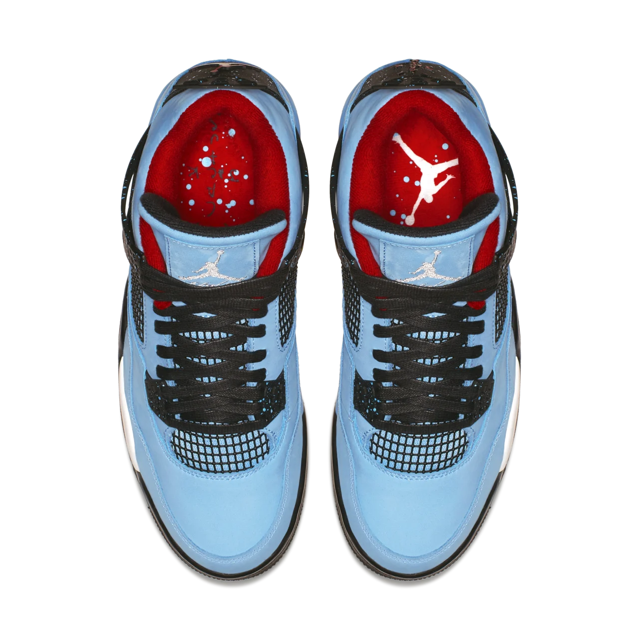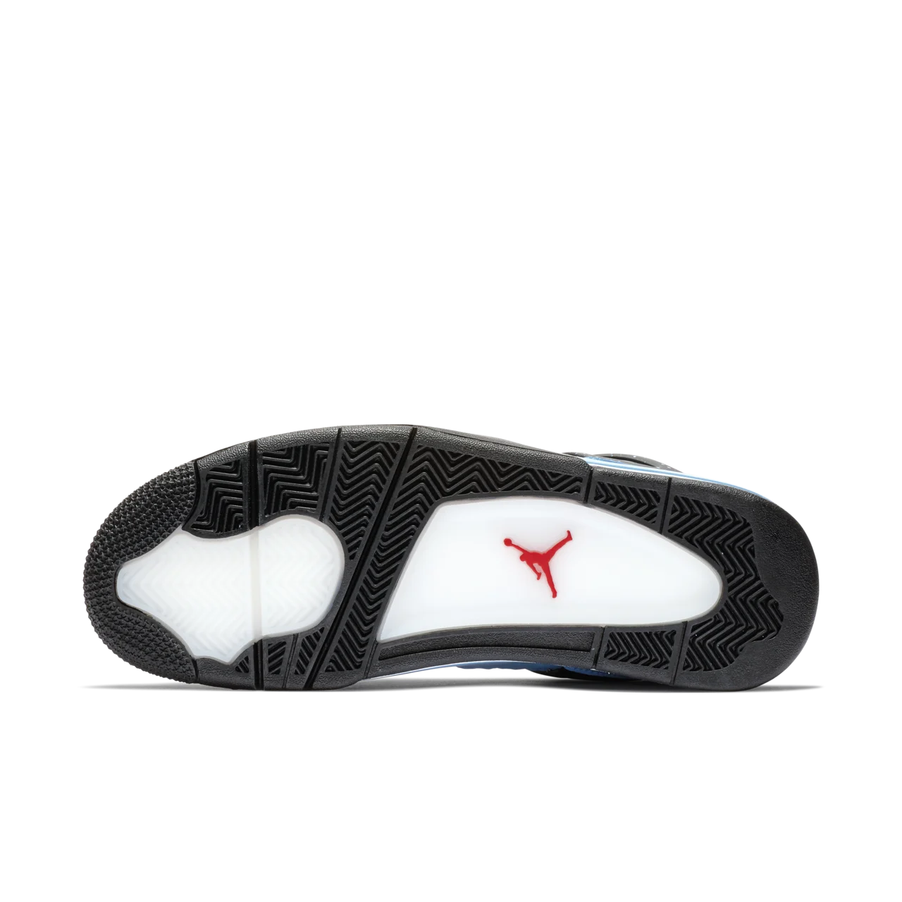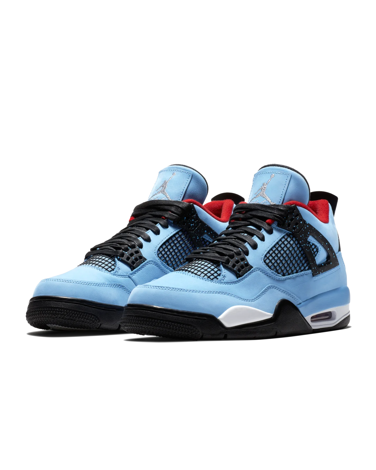 La tomaia è realizzata in pelle scamosciata premium di colore University Blue, ispirata ai colori dei Houston Oilers, la squadra di football della città natale di Travis. I dettagli in nero e rosso acceso aggiungono contrasto e profondità al design, mentre il branding Cactus Jack compare in rosso sul tallone, rendendo omaggio all’identità creativa di Travis. La suola in gomma con tecnologia Air-Sole assicura comfort e ammortizzazione eccellente, mantenendo la funzionalità tipica delle Jordan 4.