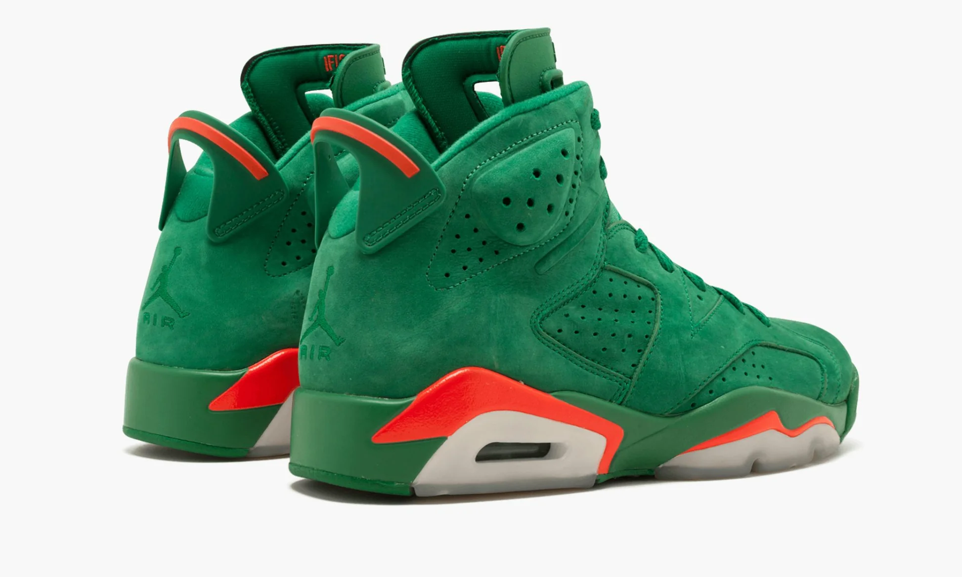 La tomaia è realizzata in morbido suede verde intenso, uniforme e lussuoso, che dona alla silhouette un aspetto audace e premium. I dettagli in arancione acceso – visibili su linguetta, inserti dell’intersuola e lacelock – richiamano perfettamente l’identità visiva di Gatorade, creando un contrasto cromatico iconico e immediatamente riconoscibile. La linguetta in neoprene con intaglio e il tallone con spoiler in TPU mantengono fedeli le linee della Jordan 6 originale.