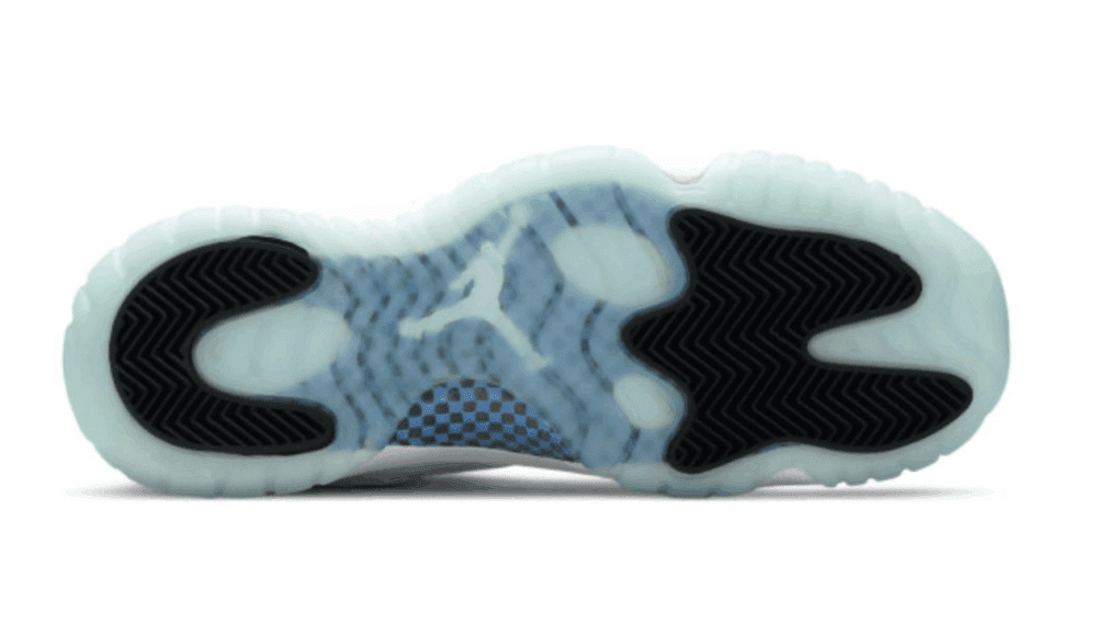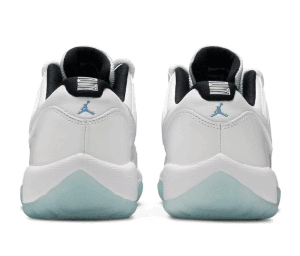 La tomaia è costruita in mesh balistico bianco lucido, con l’inconfondibile mudguard in vernice bianca a tutta lunghezza, elemento distintivo delle Jordan 11. I dettagli in azzurro Legend Blue compaiono in modo discreto sul logo Jumpman laterale, sulla linguetta interna e sulla suola, offrendo un tocco di colore glaciale che richiama la versione originale ma con un twist moderno. Il collarino imbottito e la linguetta in nylon garantiscono comfort e supporto, mantenendo la silhouette elegante e sportiva.