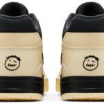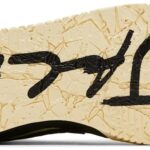 La tomaia è realizzata in canvas color muslin, con rinforzi in suede beige chiaro che aggiungono texture e profondità. Il caratteristico Swoosh rovesciato, ormai firma iconica di Travis, è proposto in una tonalità Bright Cactus che cattura immediatamente l’attenzione. Gli stessi accenti verde acido compaiono sulla linguetta, sul branding Jumpman e sui dettagli nascosti, offrendo un contrasto audace alla base neutra del design.