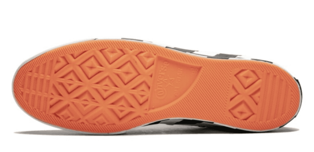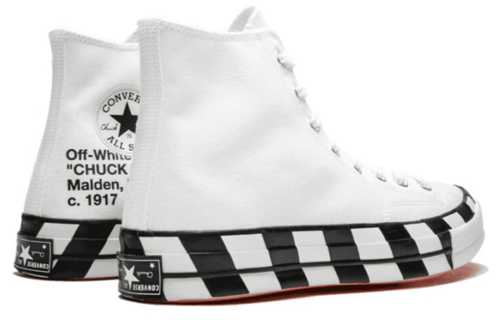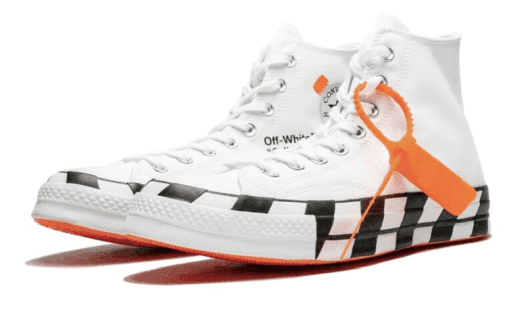 La tomaia è realizzata in canvas bianco di alta qualità, mantenendo l’essenza classica del modello, ma arricchita da dettagli esclusivi come l’iconica scritta tipografica Off-White sul lato mediale e il caratteristico zip tie arancione. La suola è caratterizzata da un design a righe diagonali bianche e nere, elemento grafico distintivo che esalta l’estetica industriale del brand. I lacci riportano la scritta “SHOELACES”, mentre il branding Off-White e il logo Converse All-Star si fondono armoniosamente, donando autenticità e modernità.