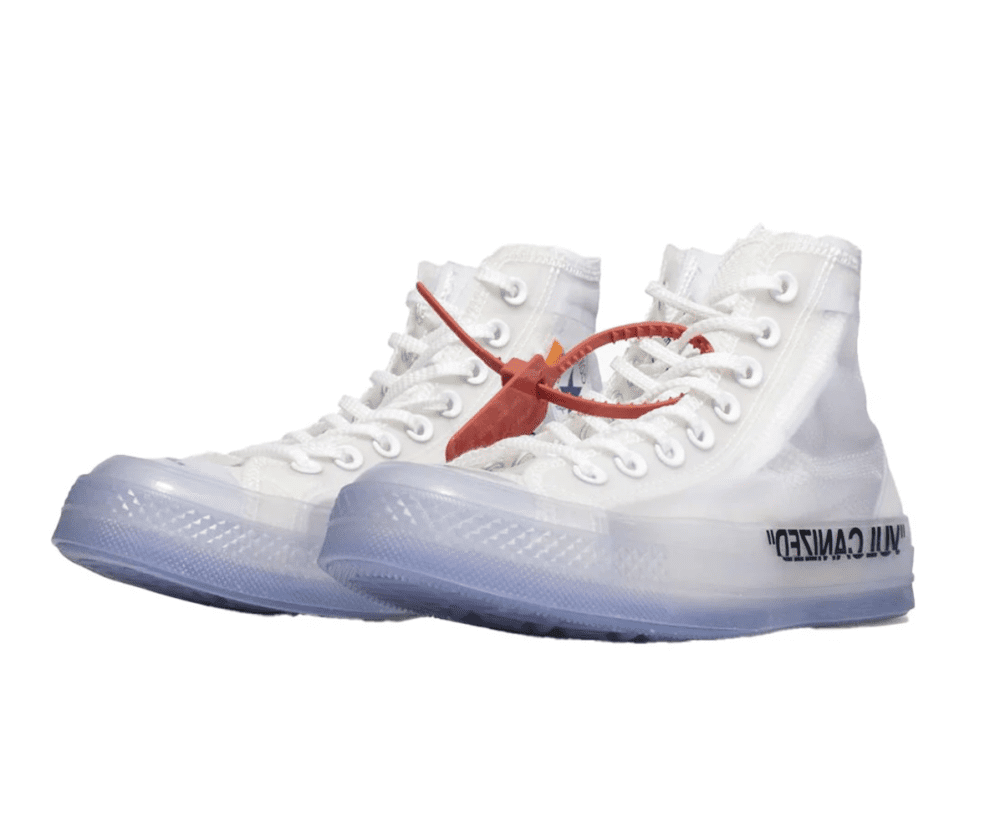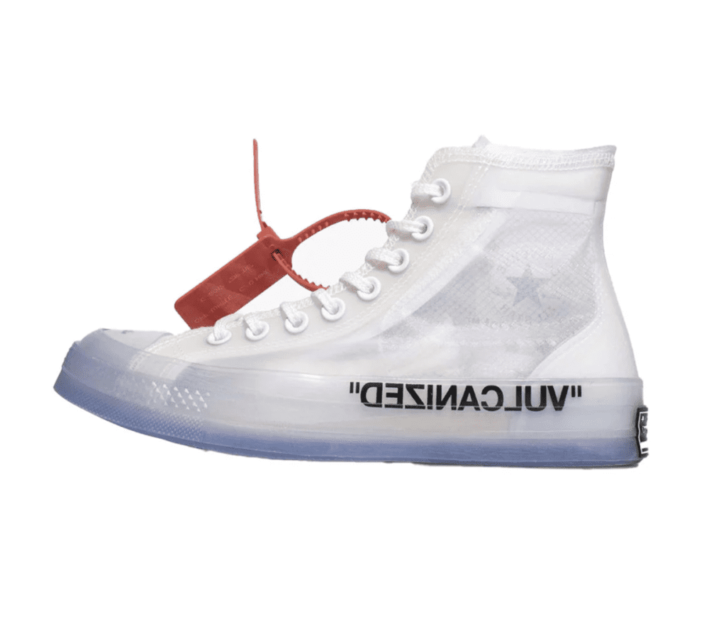 La tomaia traslucida in materiale sintetico semi-trasparente dona un look futuristico e distintivo, permettendo di giocare con il colore dei calzini per creare abbinamenti unici. Il design è arricchito da dettagli esclusivi come la scritta tipografica Off-White sul lato mediale, l’iconico zip tie rosso e l’etichetta “SHOELACES” stampata sui lacci. La suola a righe bianche e nere aggiunge un tocco grafico in perfetto stile industriale, mentre la punta in gomma e il classico logo All-Star mantengono l’essenza della tradizione Converse.