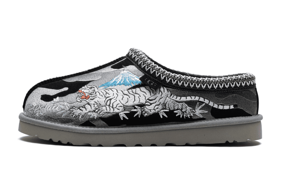Le Tasman Slipper Palace Tiger Black Camo nascono dalla fusione tra l’eleganza del design UGG e lo stile audace di Palace, dando vita a una slipper che combina comfort e moda streetwear. Questo modello esclusivo si distingue per il motivo mimetico con accenti tigrati, un mix perfetto tra sobrietà e originalità.
