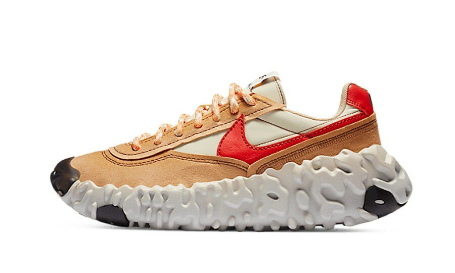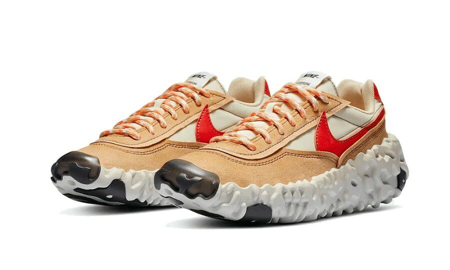 La tomaia presenta una struttura stratificata in nylon e suede, con pannelli in beige e sabbia che richiamano il paesaggio marziano, mentre il maxi Swoosh rosso fuoco in tessuto sintetico applicato lateralmente rompe il tono neutro con forza e carattere. Le cuciture a vista, le finiture grezze e l’etichetta oversize sulla linguetta confermano il design sperimentale, pensato per sembrare quasi “prototipale”.